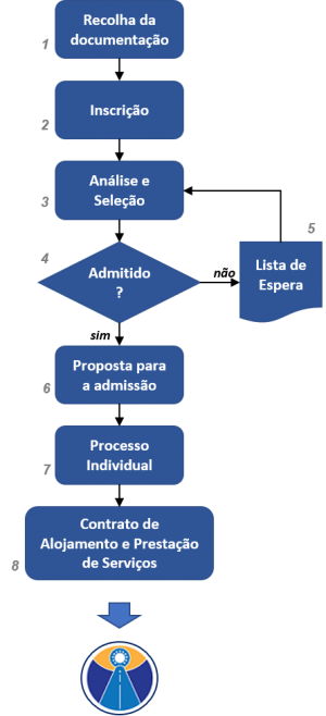 - A Divisão das Respostas Sociais analisa a candidatura com base nos critérios prioritários de admissão e, de acordo com o resultado obtido, o candidato será colocado na posição relativa da Lista de Espera. O primeiro da lista será o selecionado e, no caso de desistência ou da não disponibilidade para ingressar de imediato, avançará o seguinte, e assim sucessivamente.